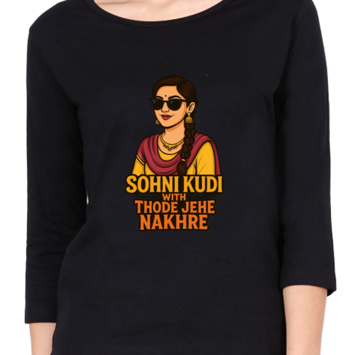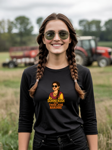 Add a playful twist to your look with the Sohni Kudi – Thode Jehe Nakhre T-Shirt. Designed for the girl who knows she’s got charm and isn’t afraid to show a little attitude, this tee celebrates the perfect mix of beauty and nakhre. Bold, fun, and full of Punjabi swag, it’s a nod to every confident girl who turns heads and owns her vibe.